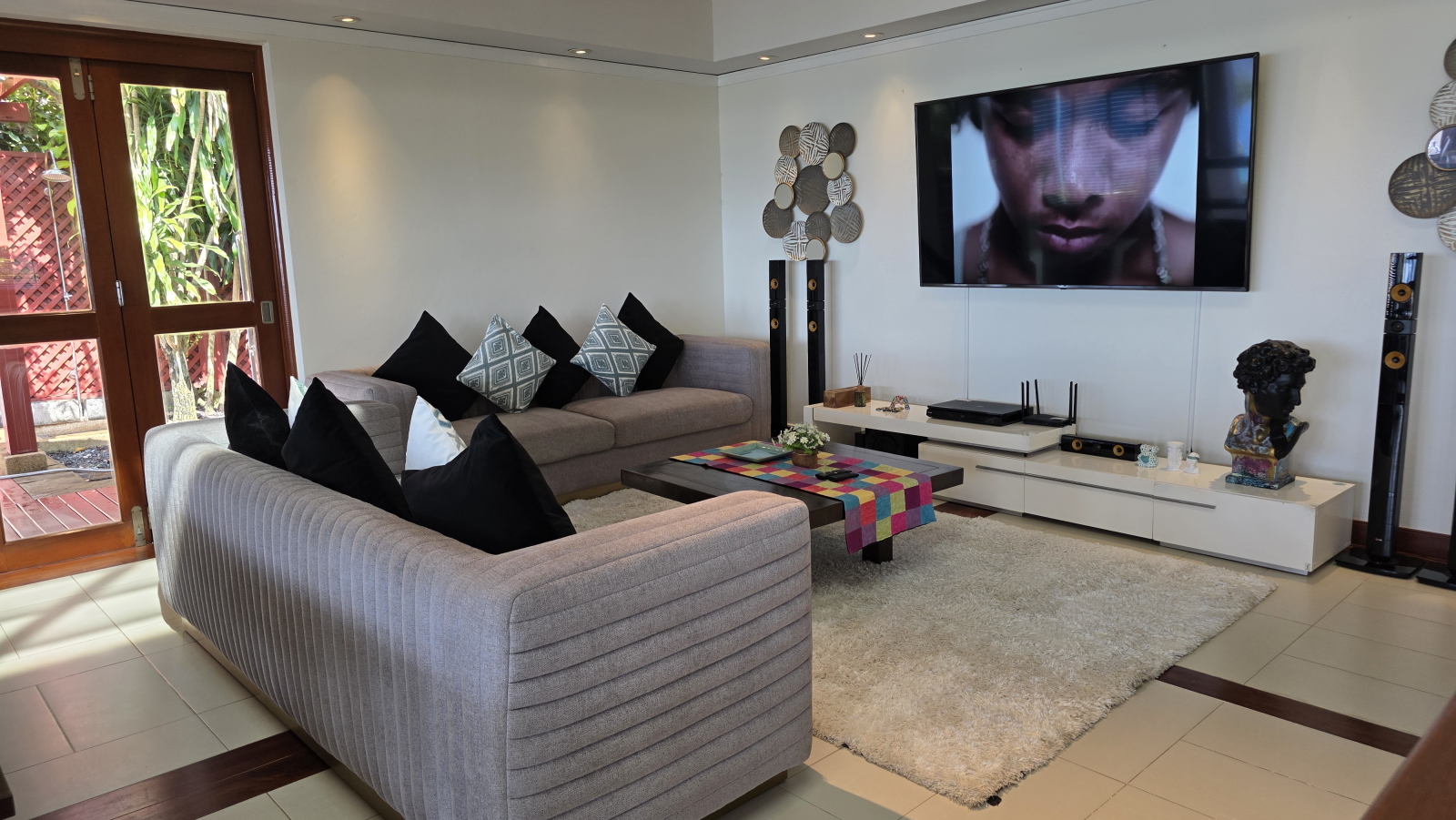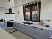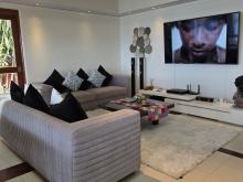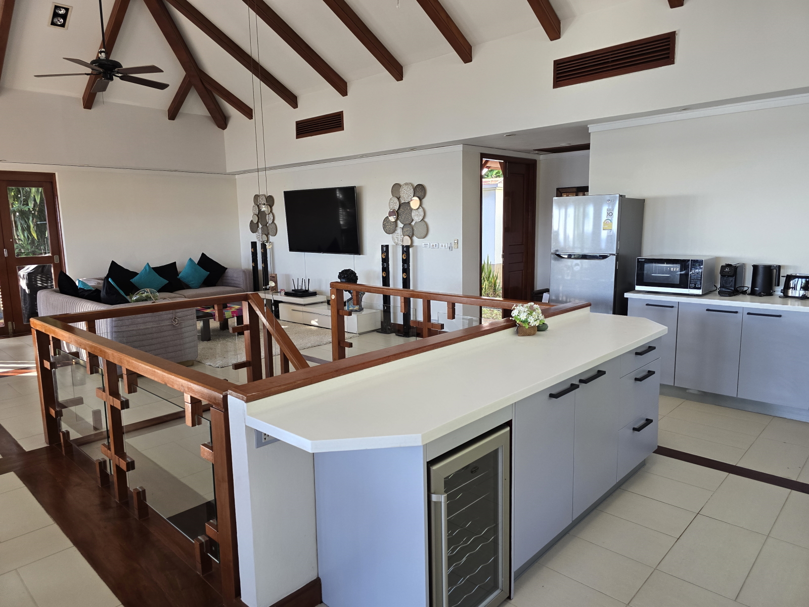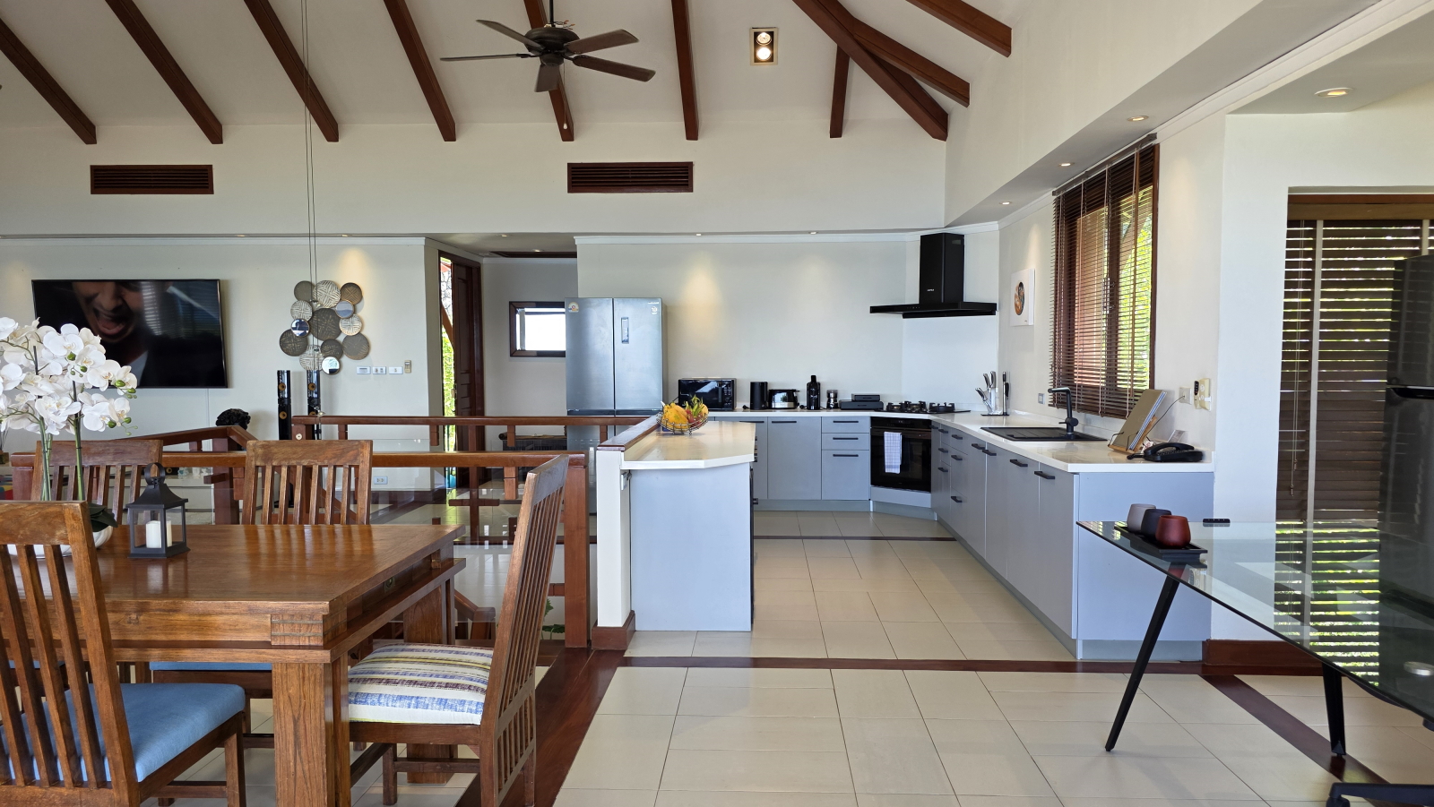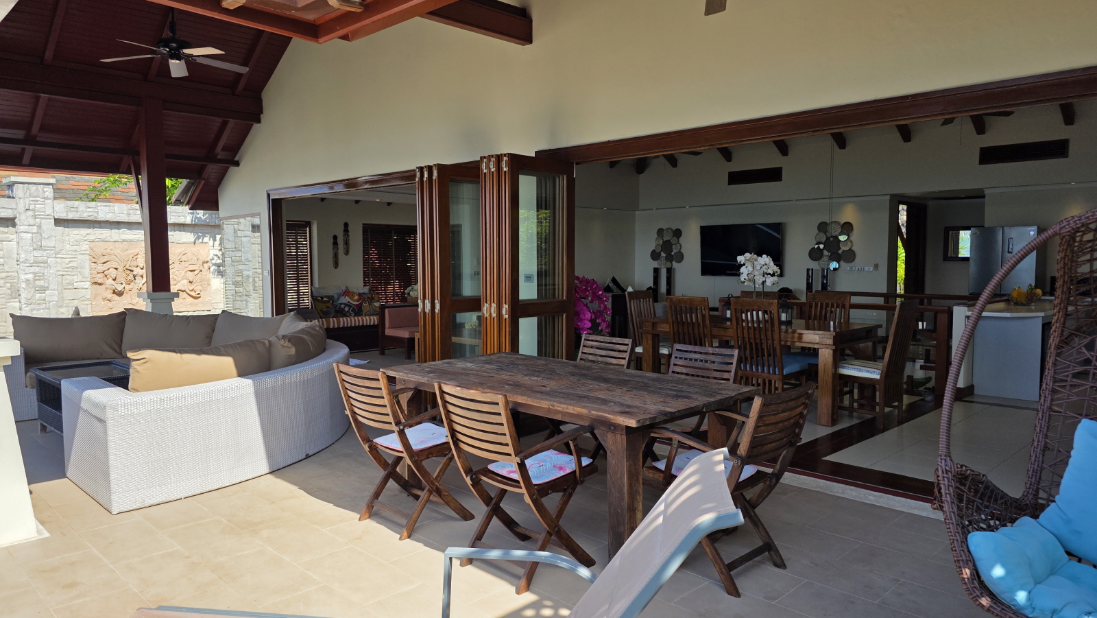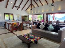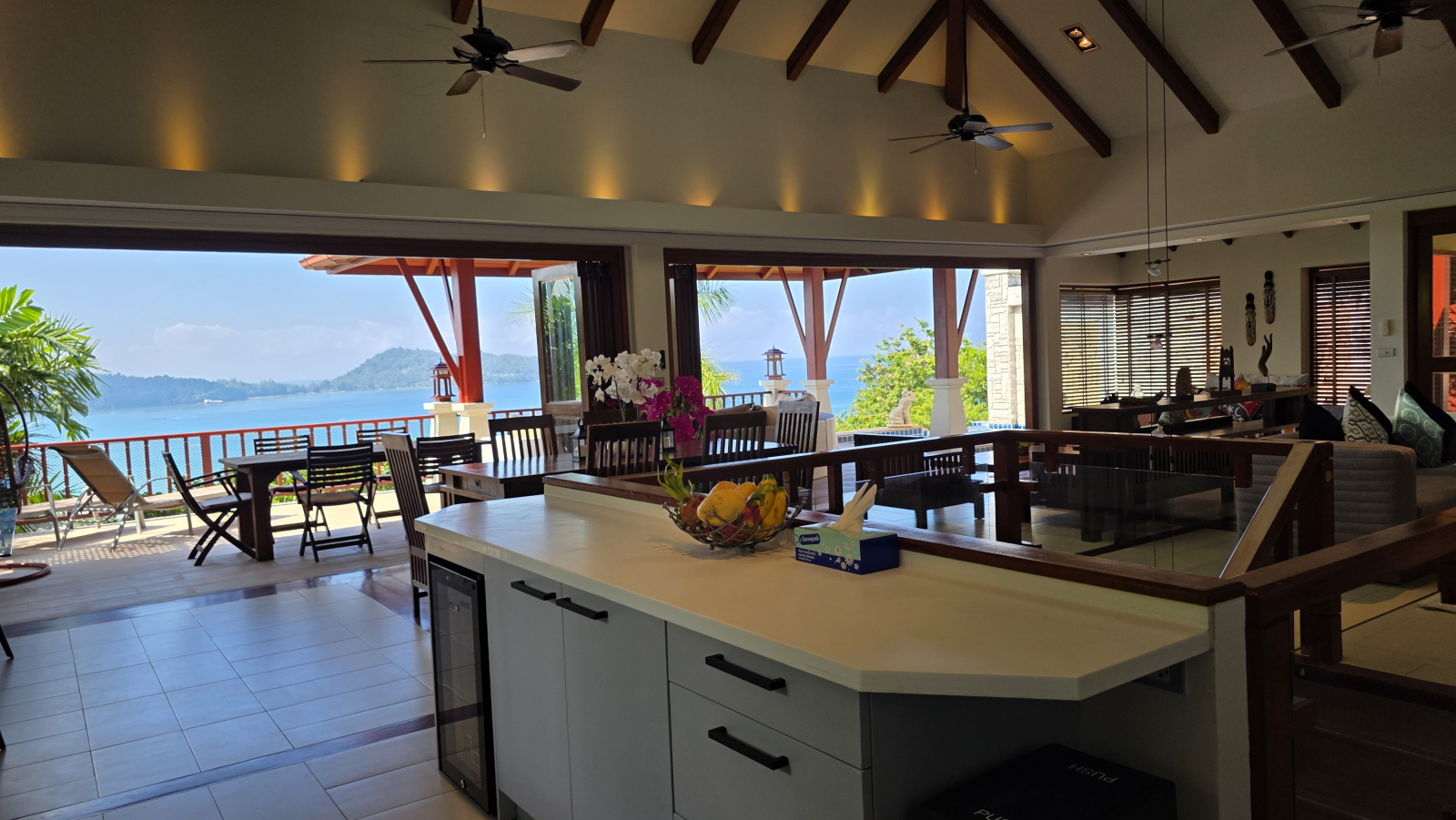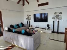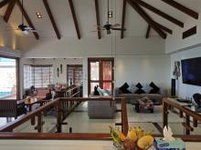 L'étage supérieur a de belles touches de bois de teck et sa luminosité crée une ambiance joyeuse et tropicale. Chaque coin de l'étage supérieur a un endroit confortable pour se détendre et profiter de la vue. La grande terrasse exterieure contient un salon et une salle a manger ainsi qu’un espace bain de soleil pour bronzer près de la piscine.