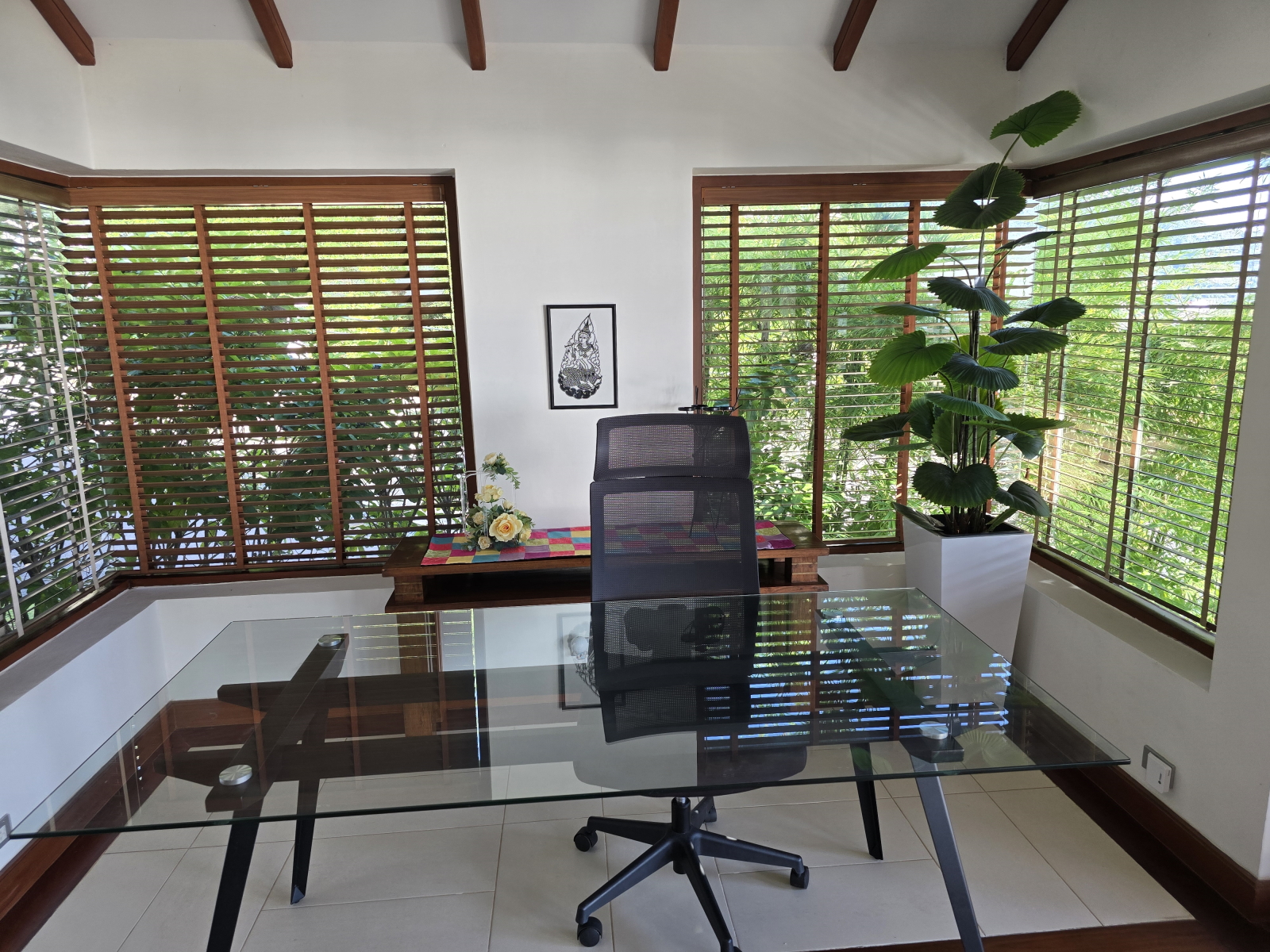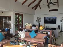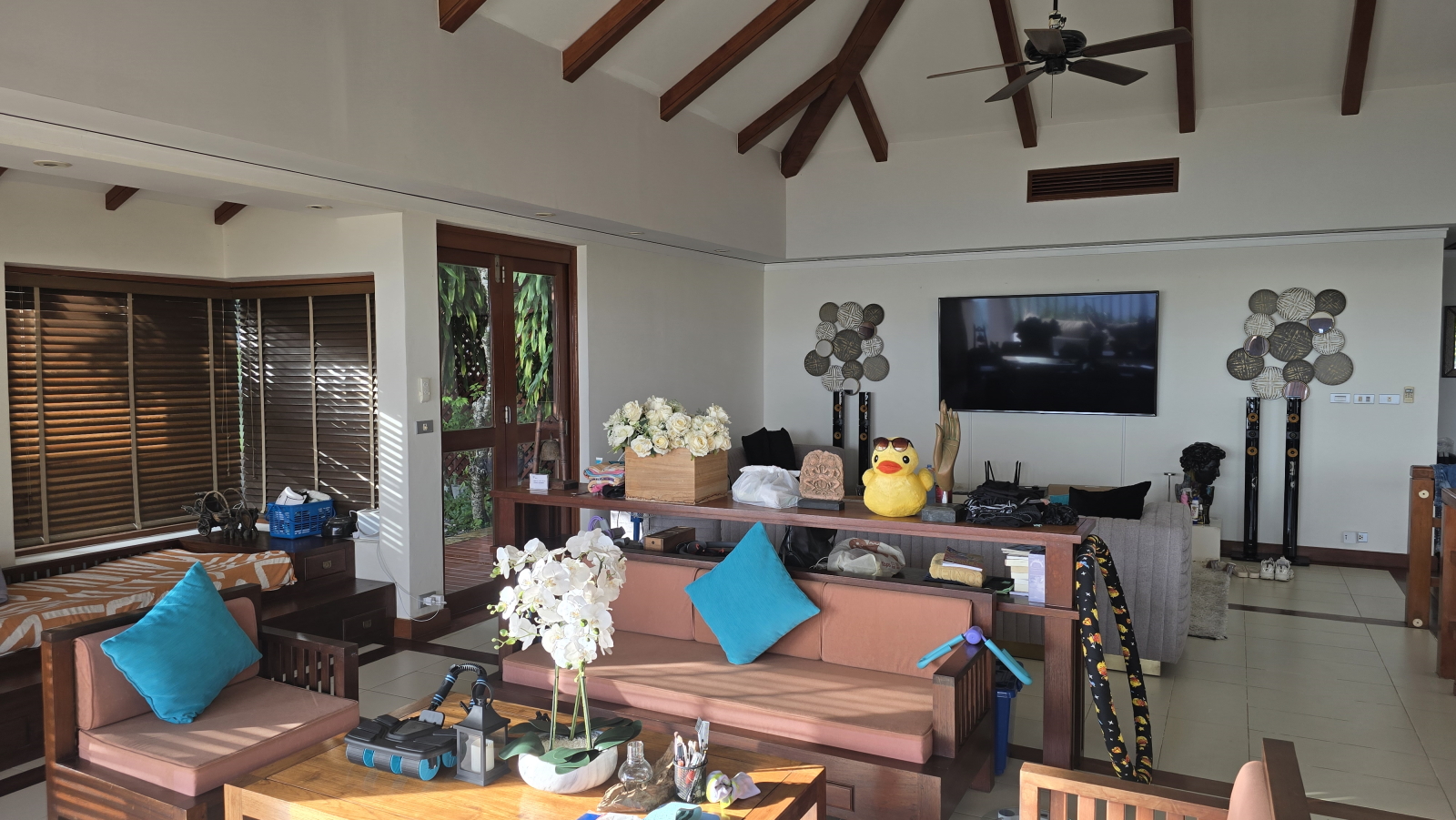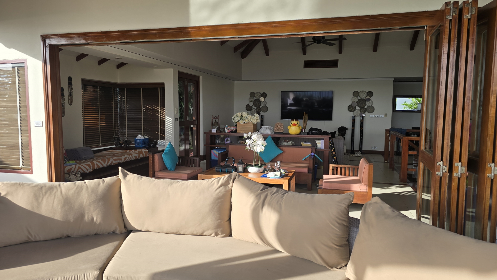The upper floor has beautiful teak wood touches and sunshine accent colours creating a cheerful and tropical ambiance. Every corner of the upper level has a comfortable place to lounge, socialise and enjoy the views. The large terrace has a covered sitting area and coffee table plus extended uncovered deck for sunbathing next to the pool.