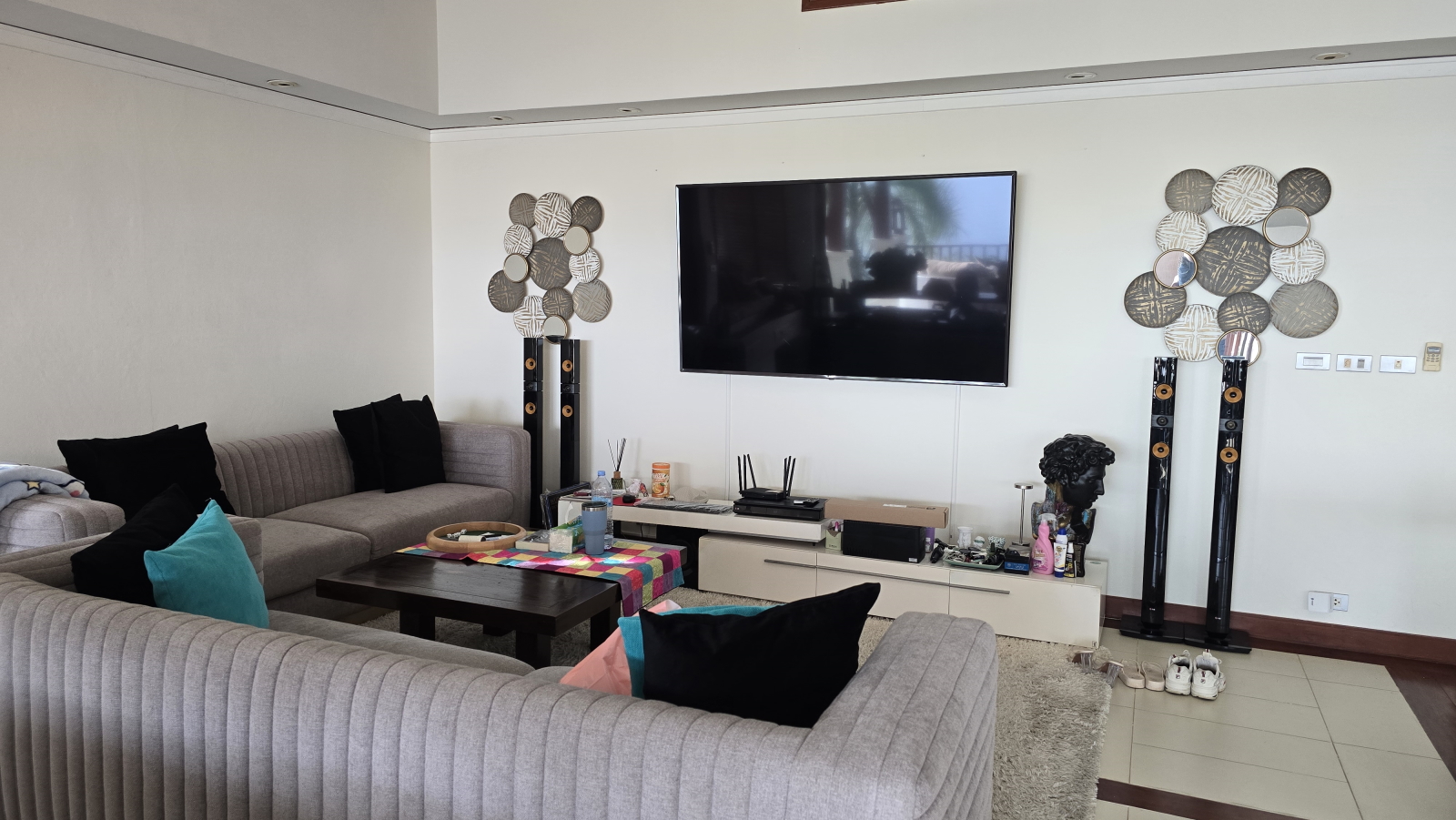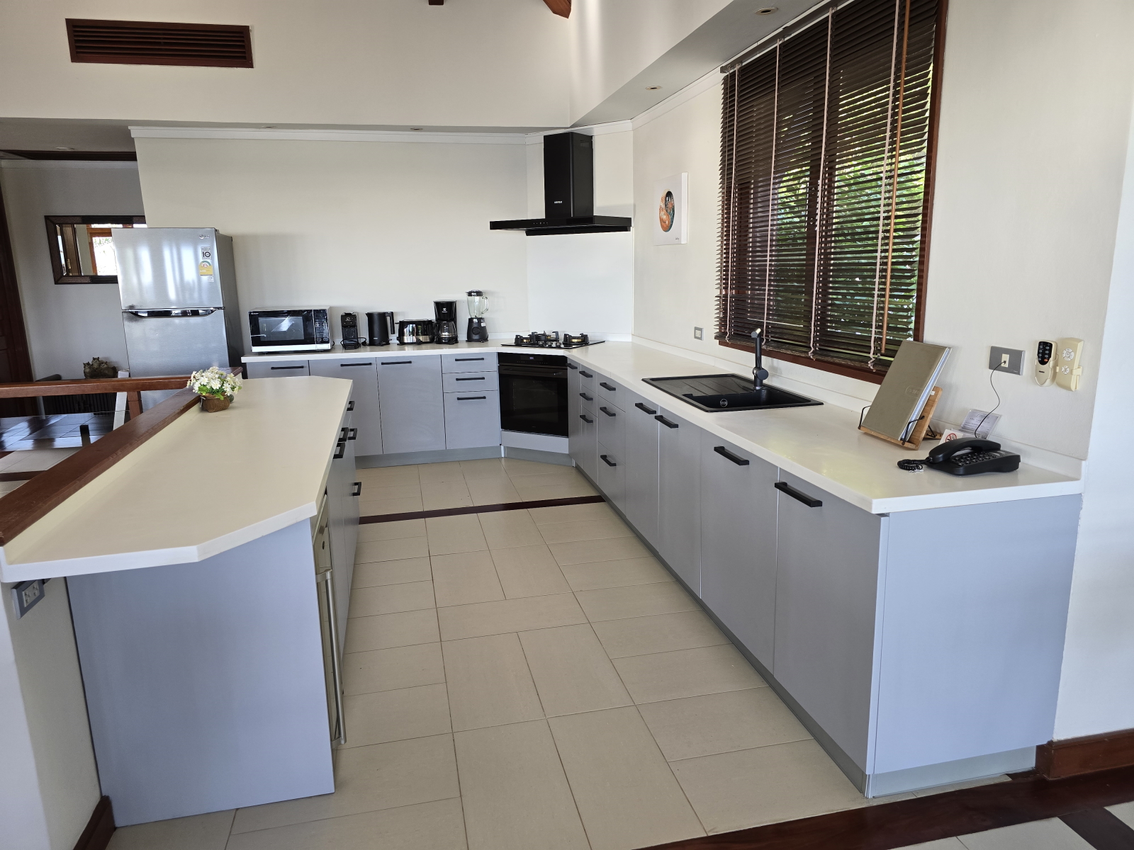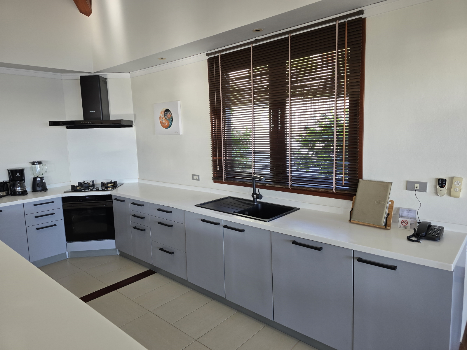 The upper floor has beautiful teak wood touches and sunshine accent colours creating a cheerful and tropical ambiance. Every corner of the upper level has a comfortable place to lounge, socialise and enjoy the views. The large terrace has a covered sitting area and coffee table plus extended uncovered deck for sunbathing next to the pool.