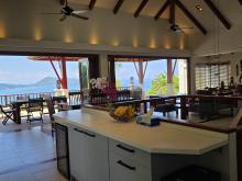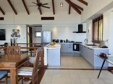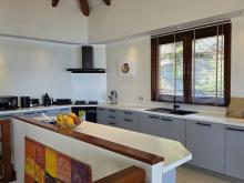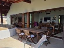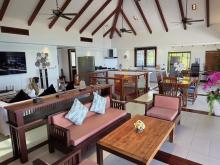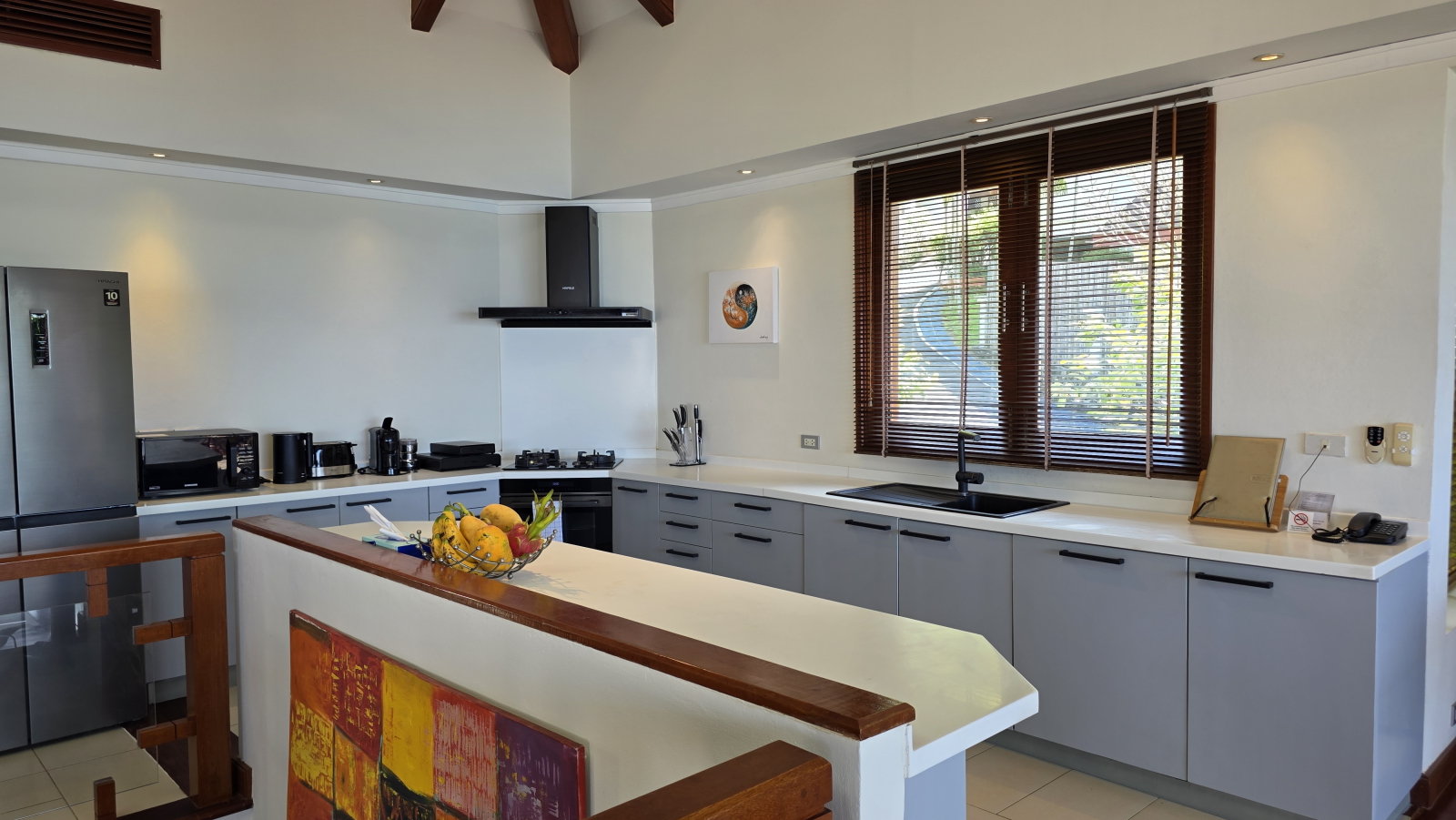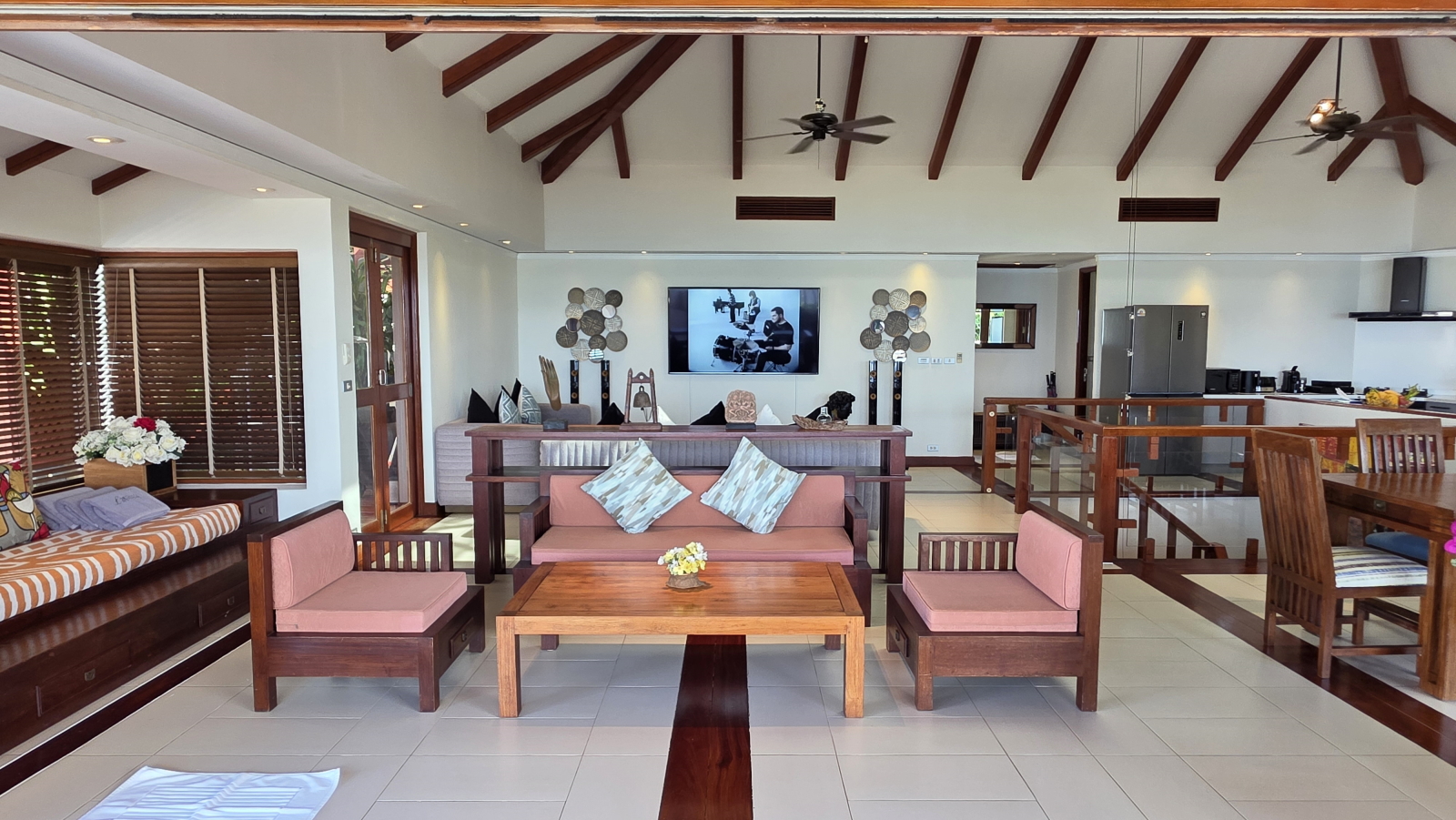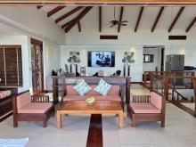 The upper floor has beautiful teak wood touches and sunshine accent colours creating a cheerful and tropical ambiance. Every corner of the upper level has a comfortable place to lounge, socialise and enjoy the views. The large terrace has a covered sitting area and coffee table plus extended uncovered deck for sunbathing next to the pool.