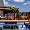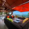 The stylish upper floor with open living spaces and an extensive balcony blends Asian décor with contemporary furnishings creating a relaxing and luxurious ambiance. Guests have a choice of dining in the air-conditioned interiors or al fresco on the front terrace. There is also a shady pavilion to the side of the property featuring a relaxing daybed next to a bar.