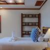 The lower floor features two master bedrooms with king-size beds and luxury bathrooms with whirlpool tubs and separate showers. The third bedroom has twin beds that can be converted to a king-size and a private bathroom with shower, making this villa ideal for three couples sharing or families with children.